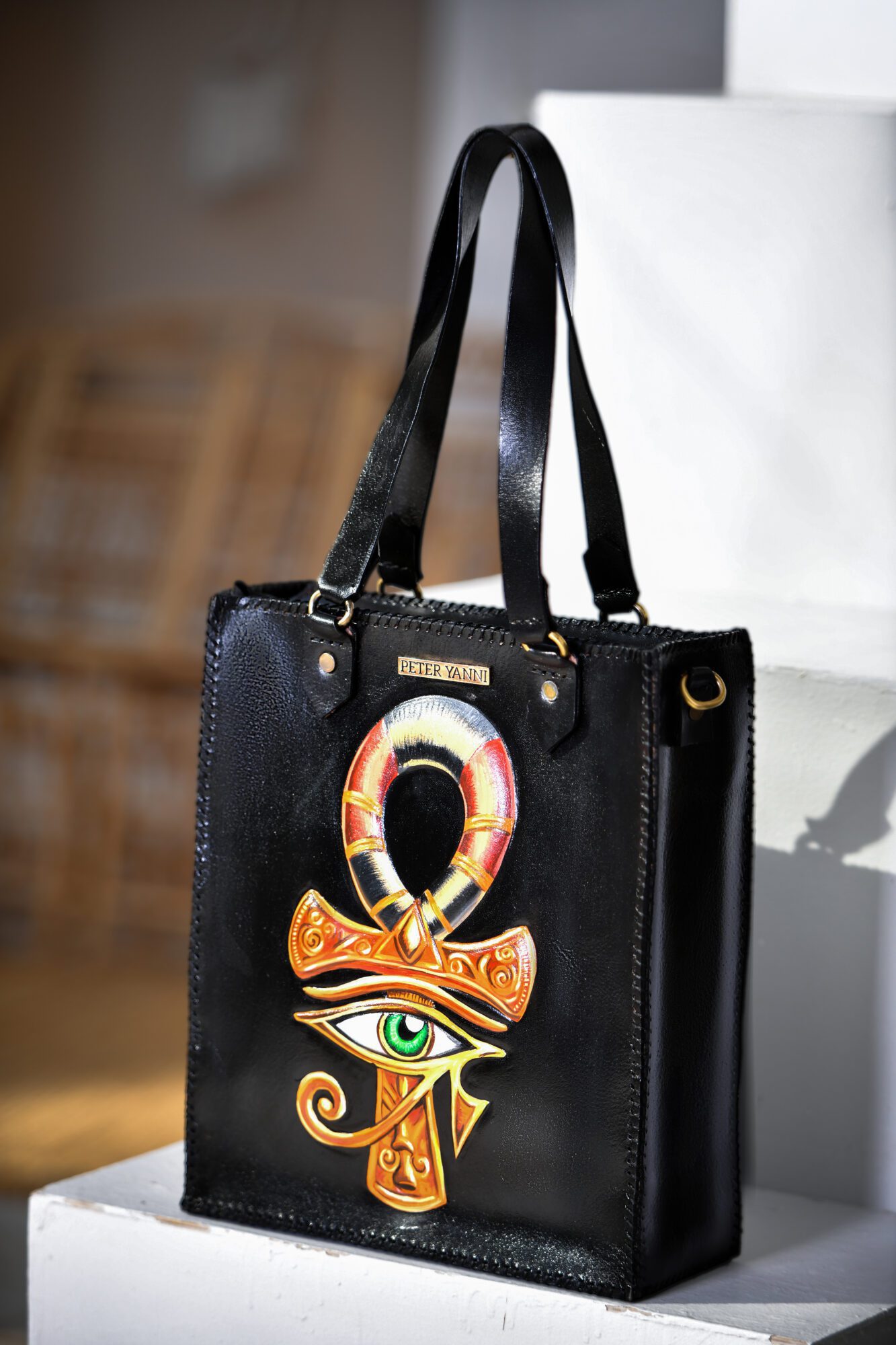 35cm x 30cm x 10cm Fully Hand-Embossed and Hand-painted Internal genuine leather lining Shoulder strap Back zipper pocket Internal Zipper pocket one year guarantee