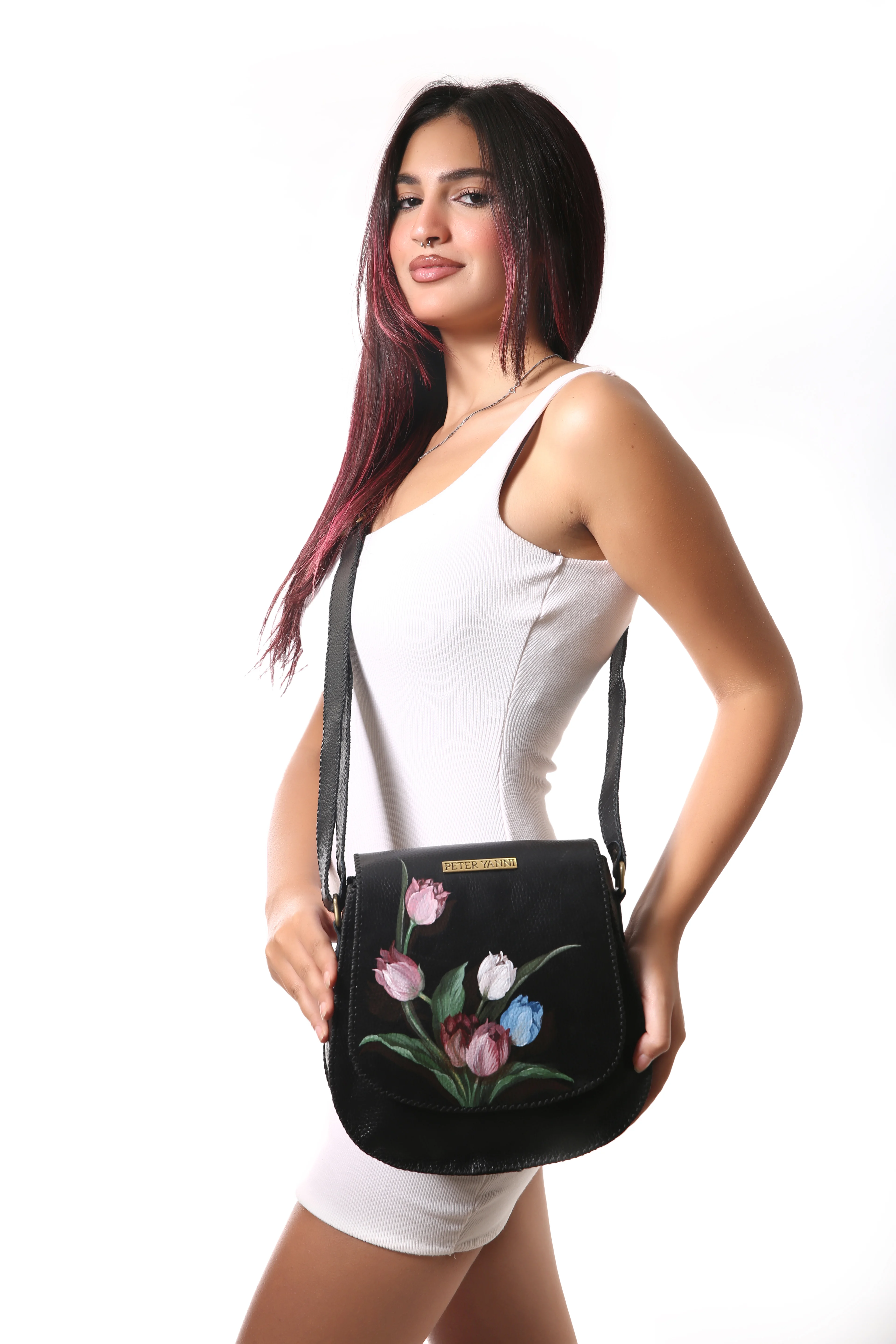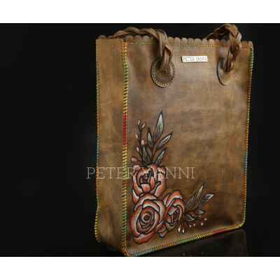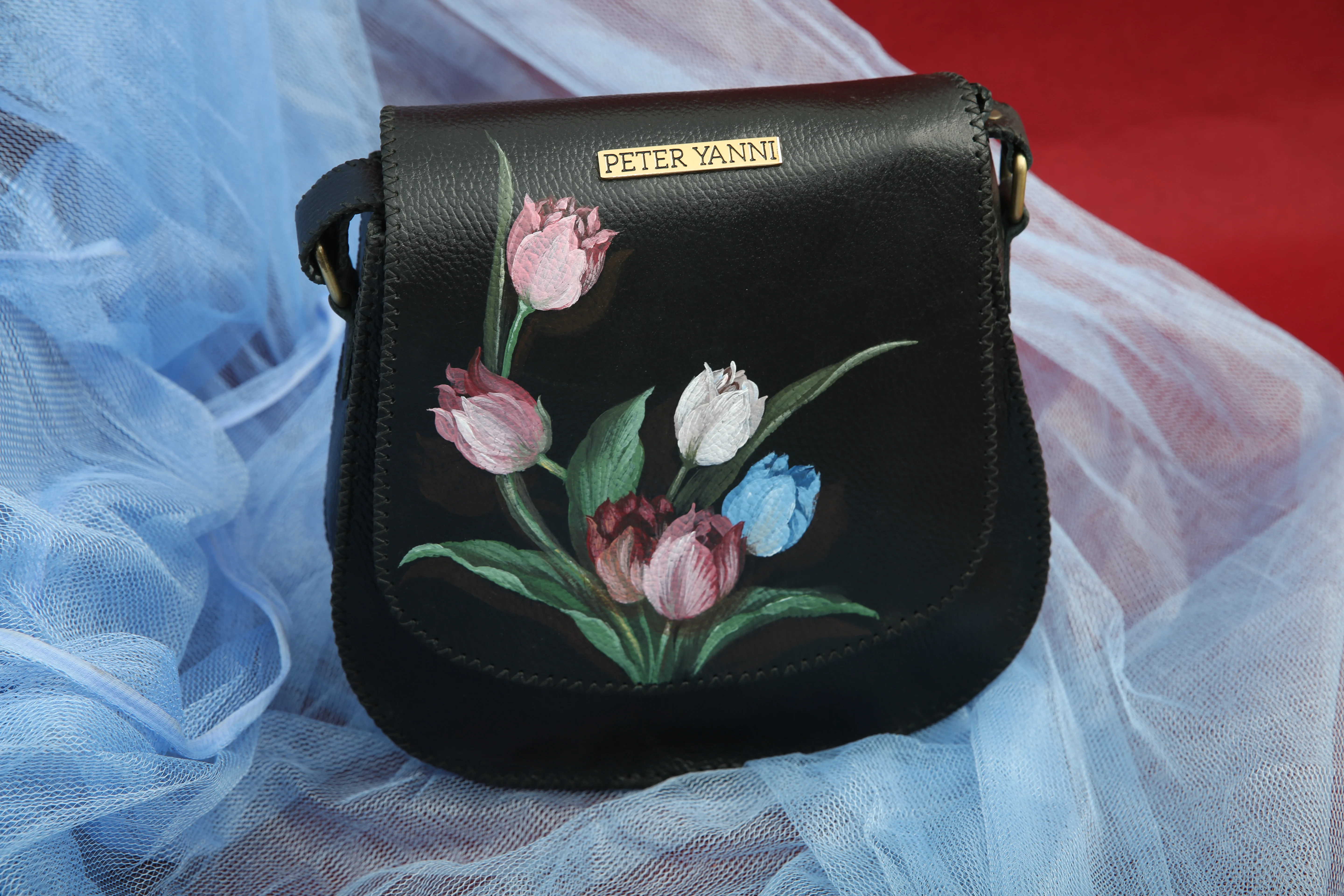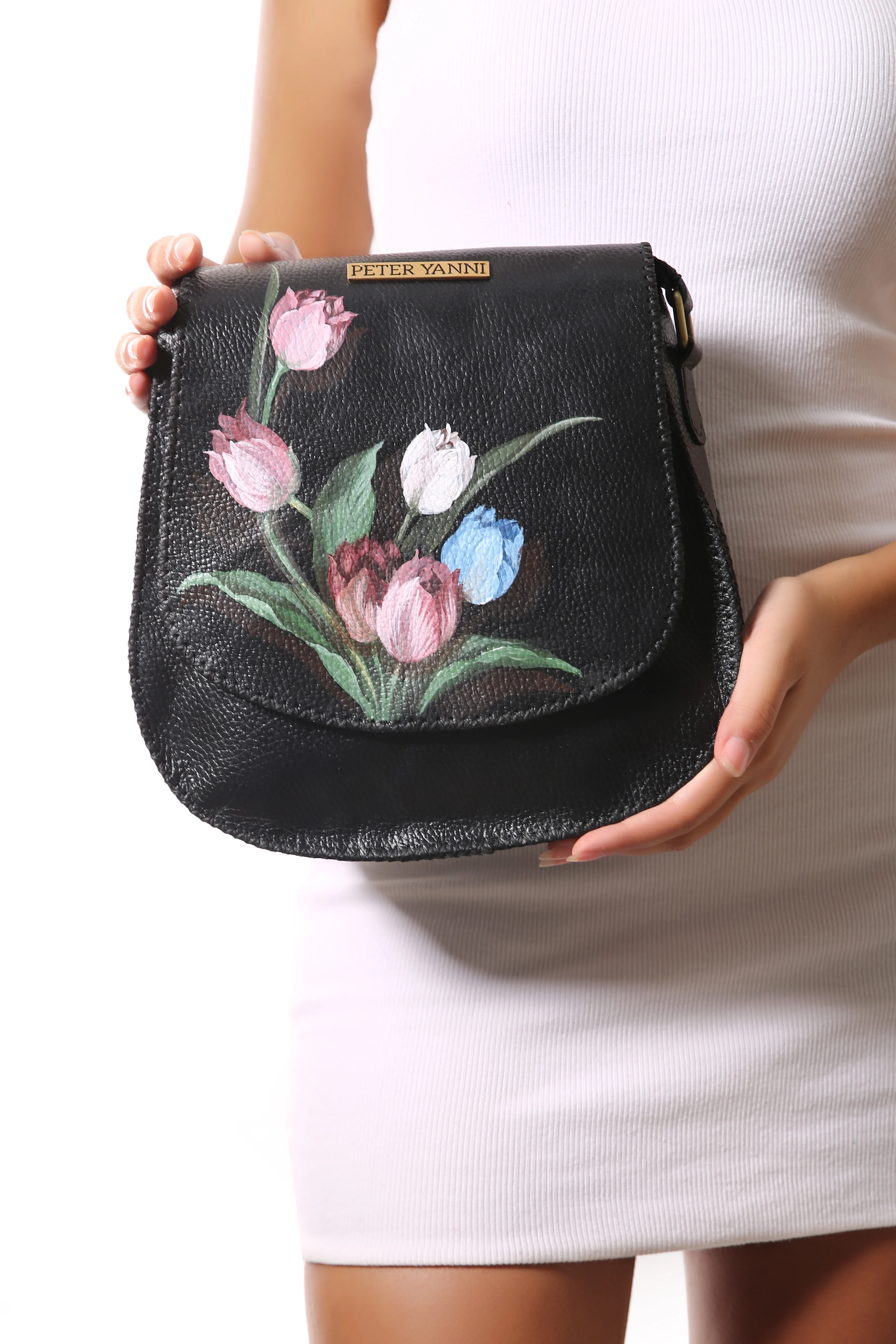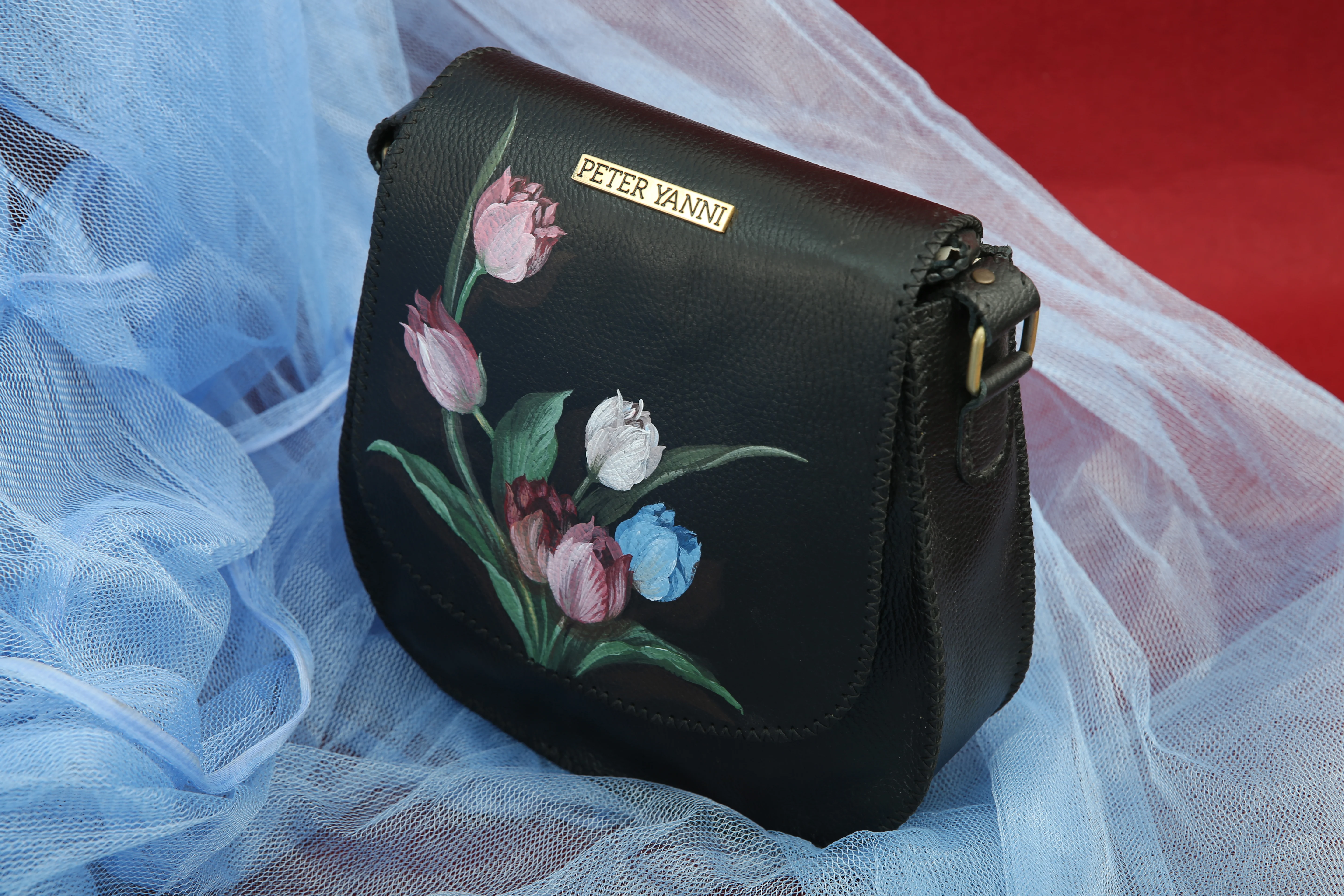 21cm x 26cm x 7cm Fully hand painted Internal genuine leather lining Back and interior zipper pockets one year guarantee