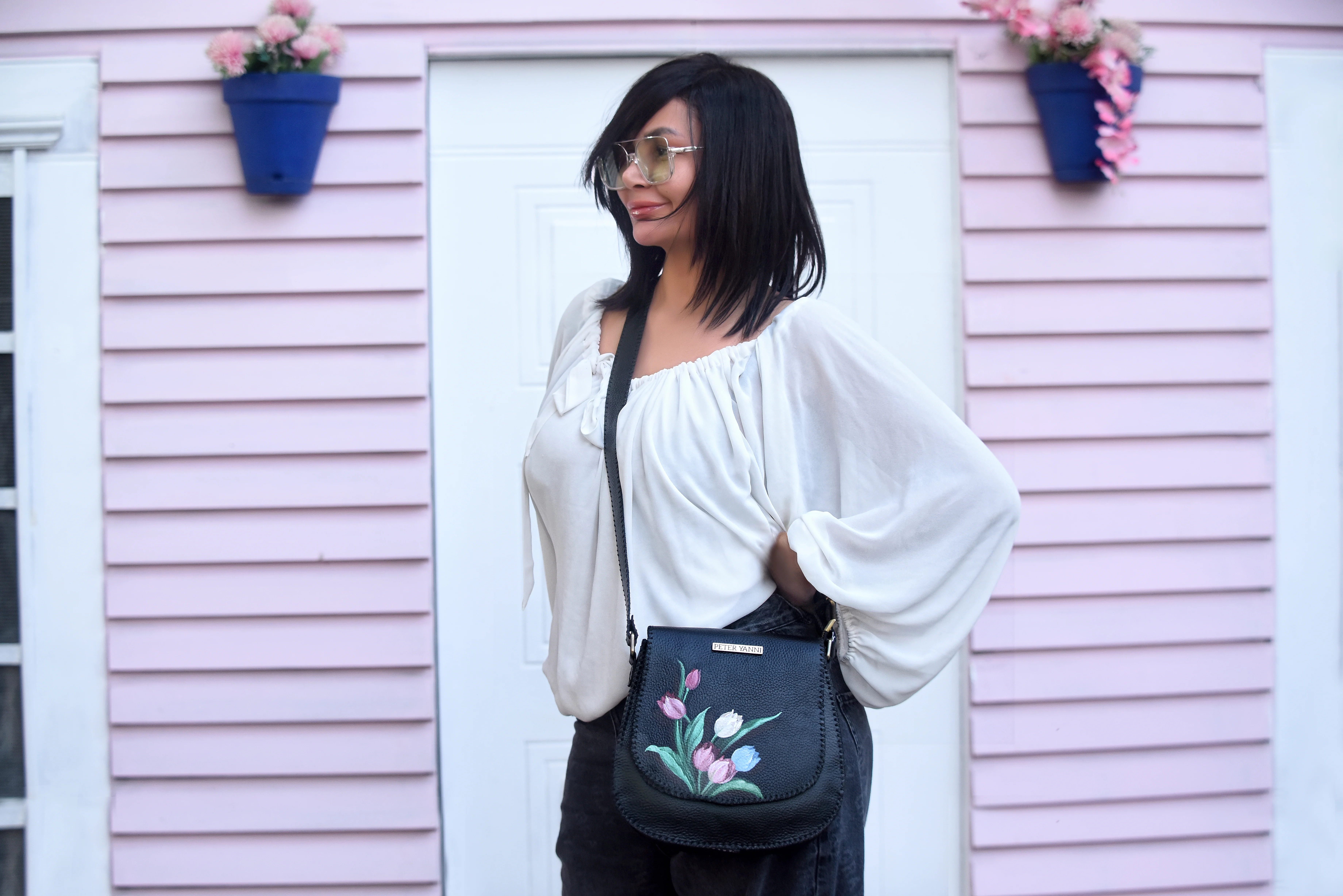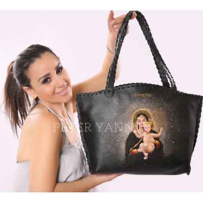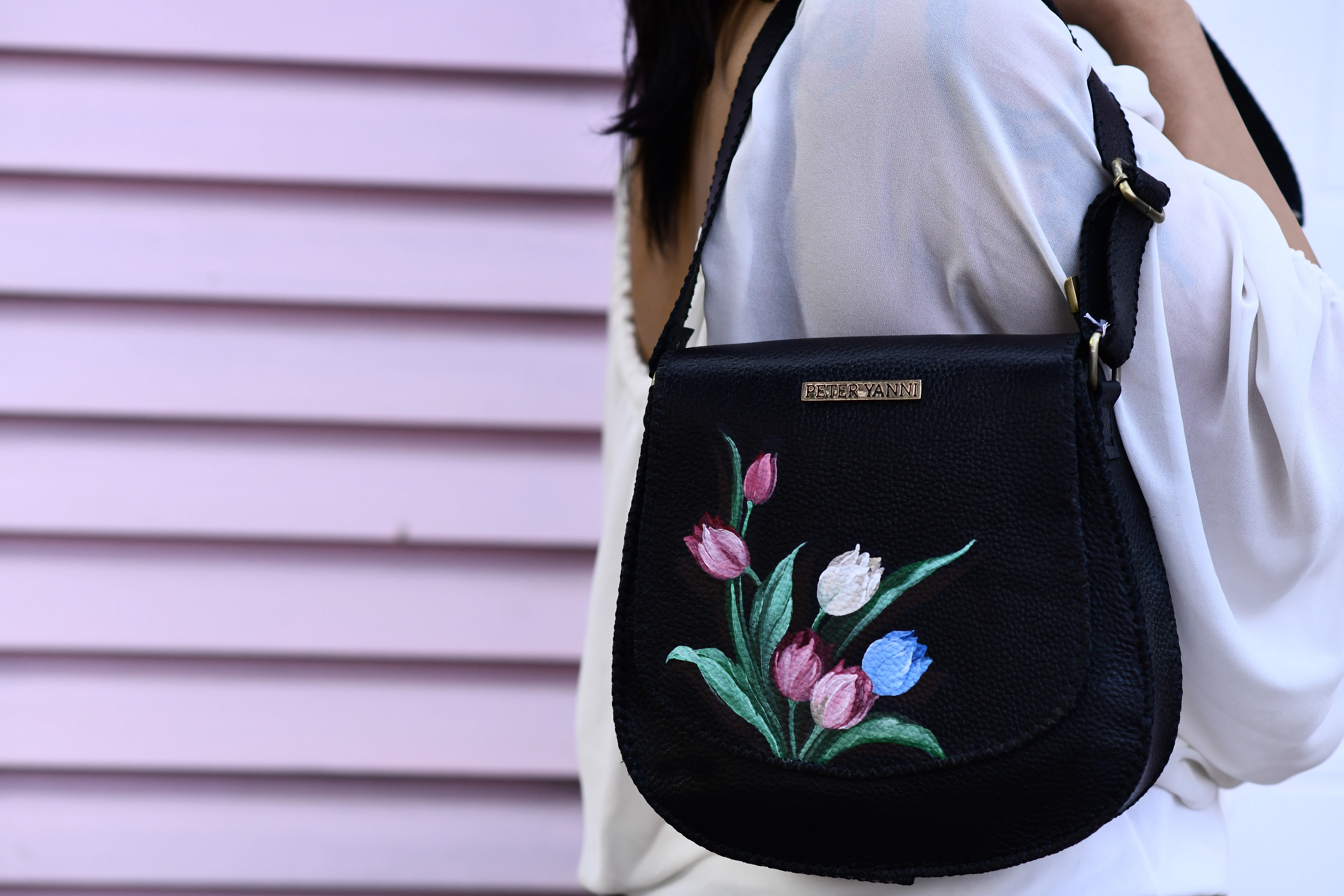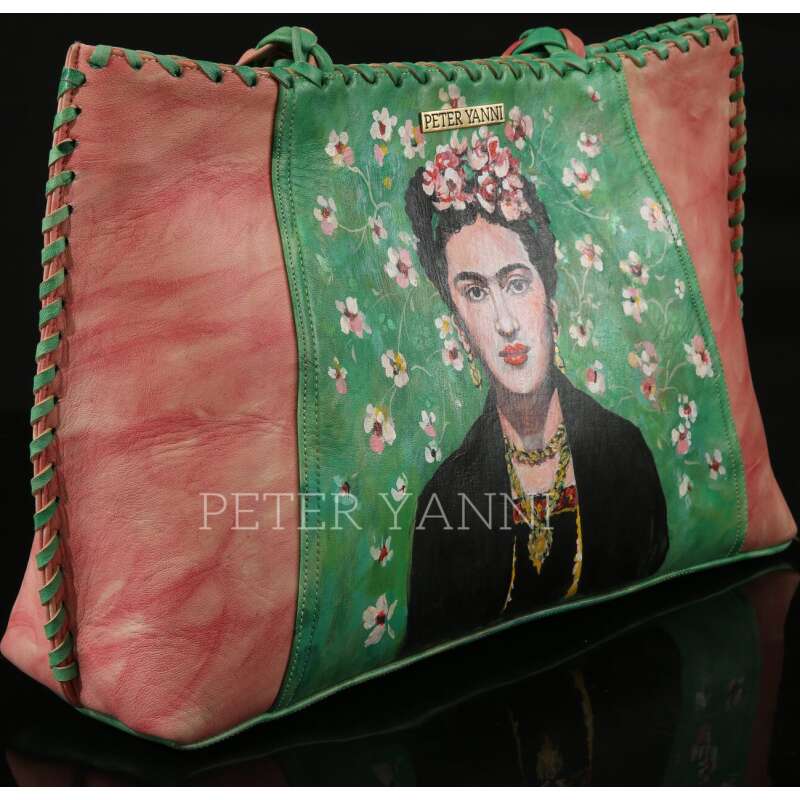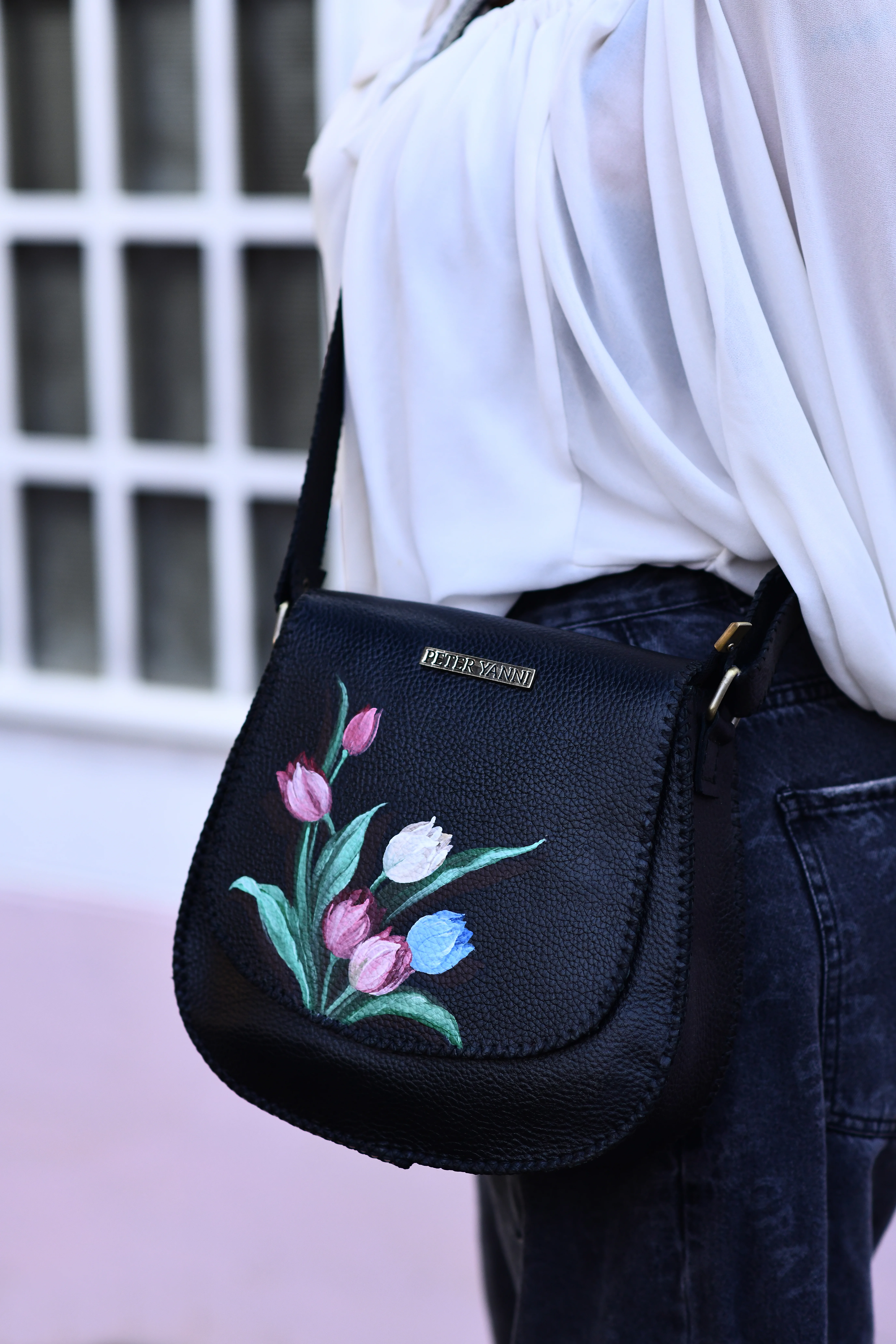 21cm x 26cm x 7cm Fully hand painted Internal genuine leather lining Back and interior zipper pockets one year guarantee