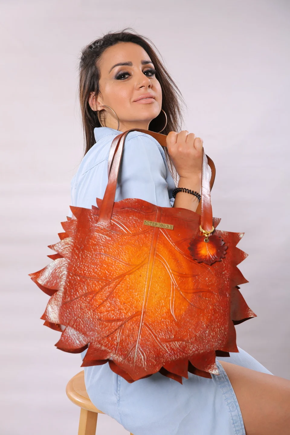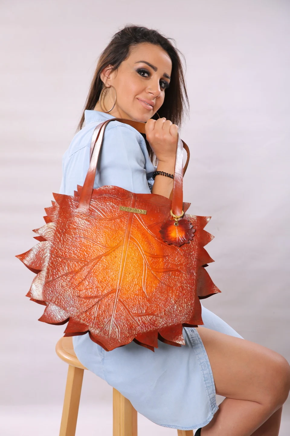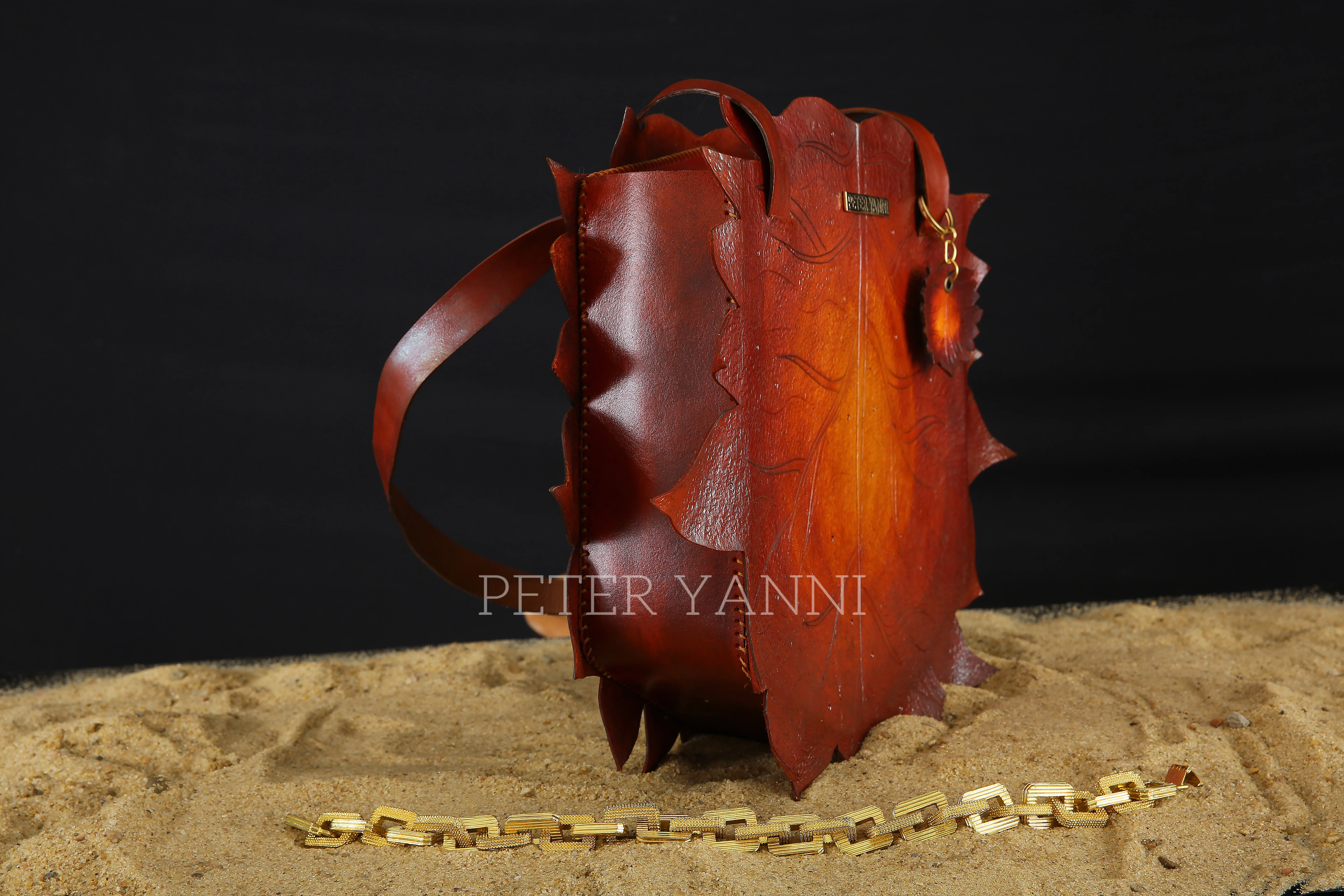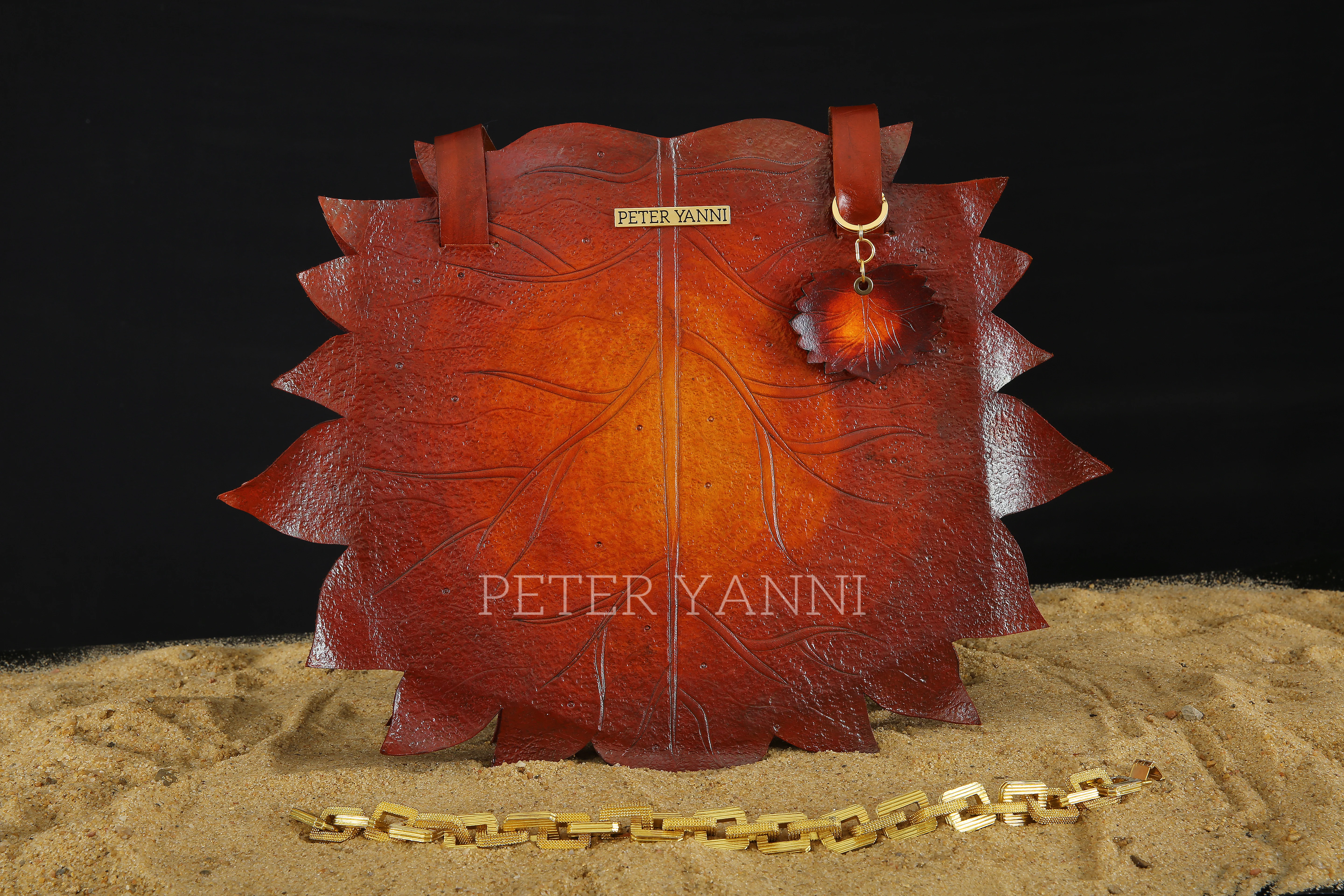 45cm x 8cm Fully hand stamped artwork Genuine leather interiors Back and internal zipper pocket Zipper cover closure one year guarantee