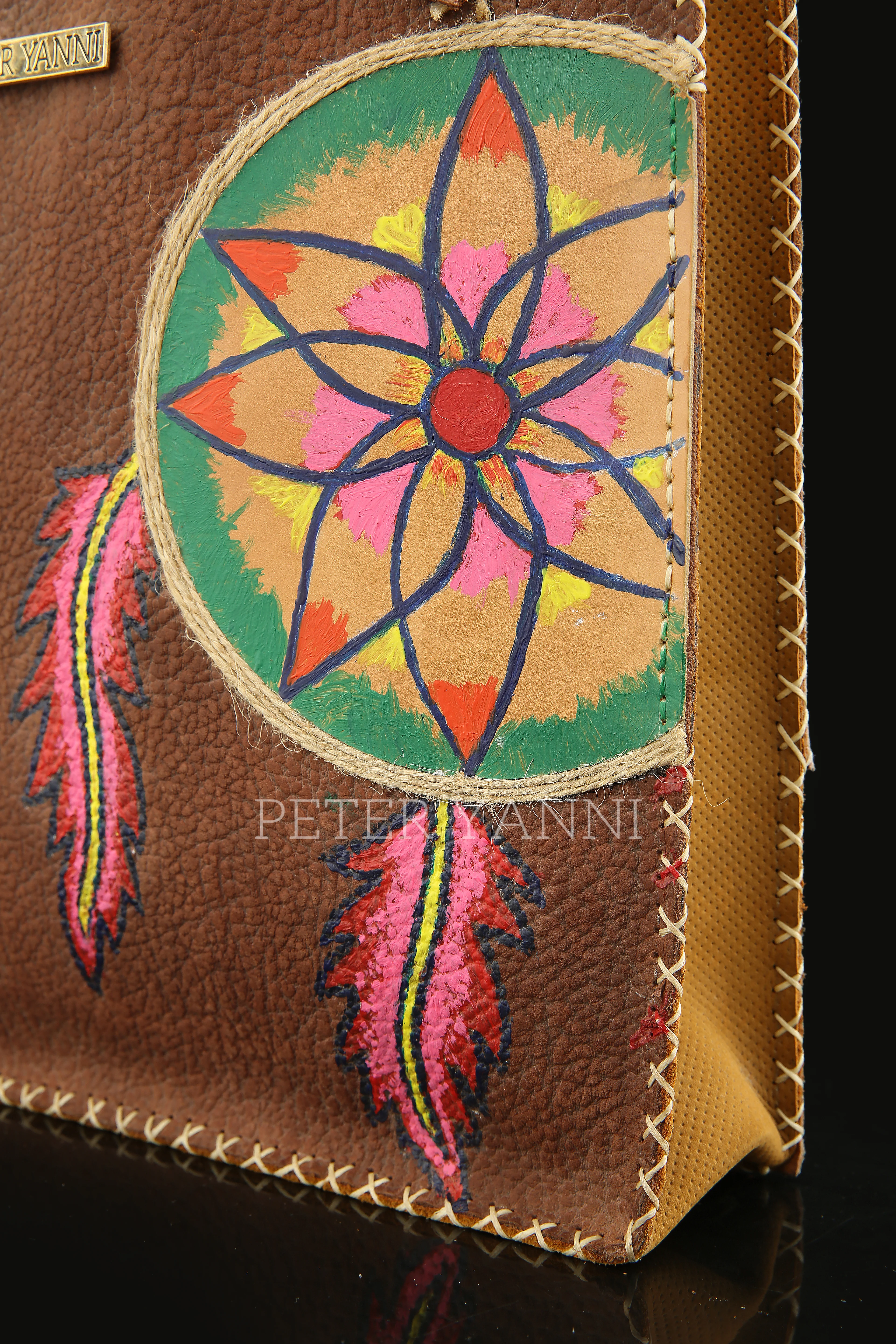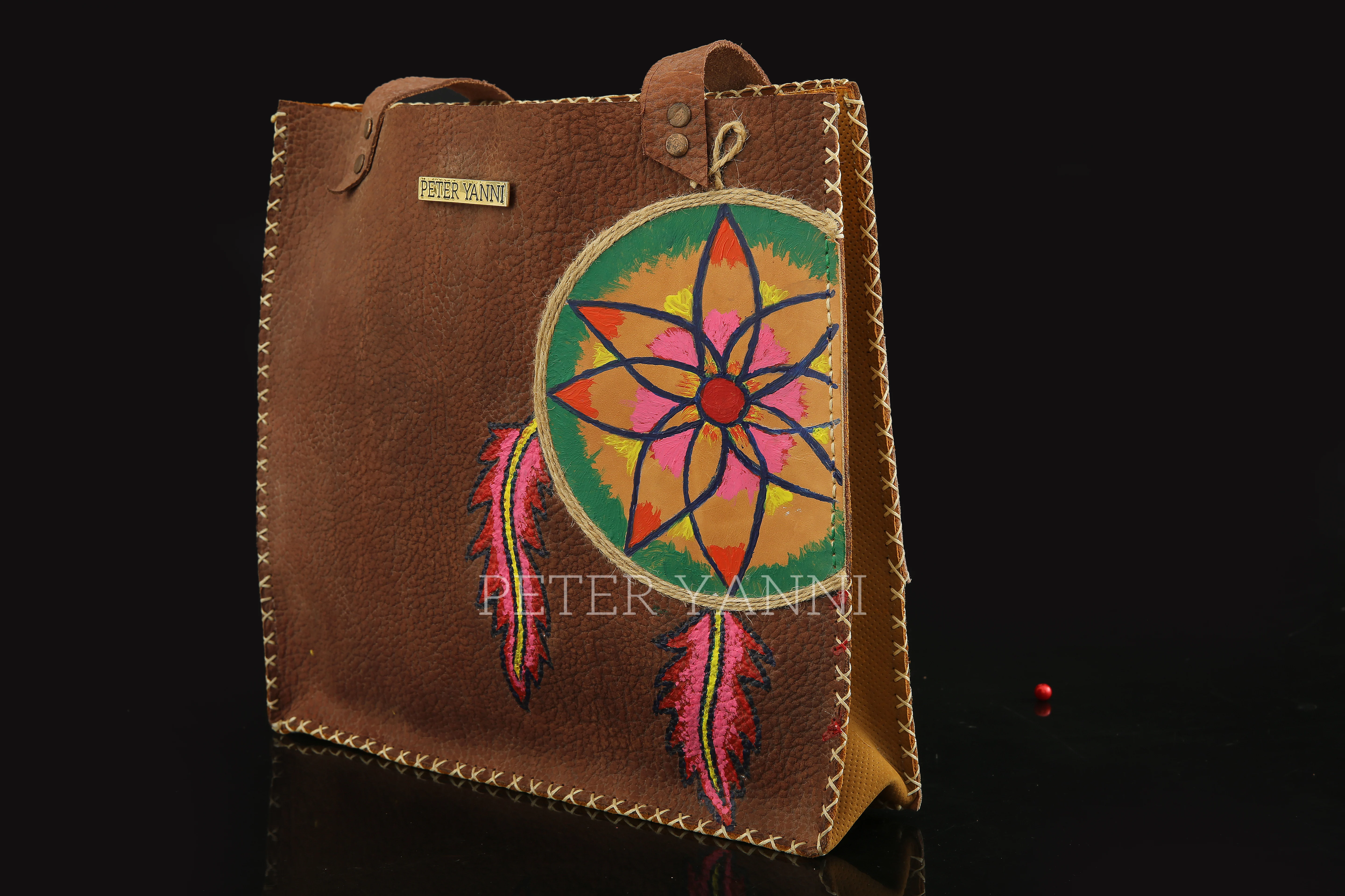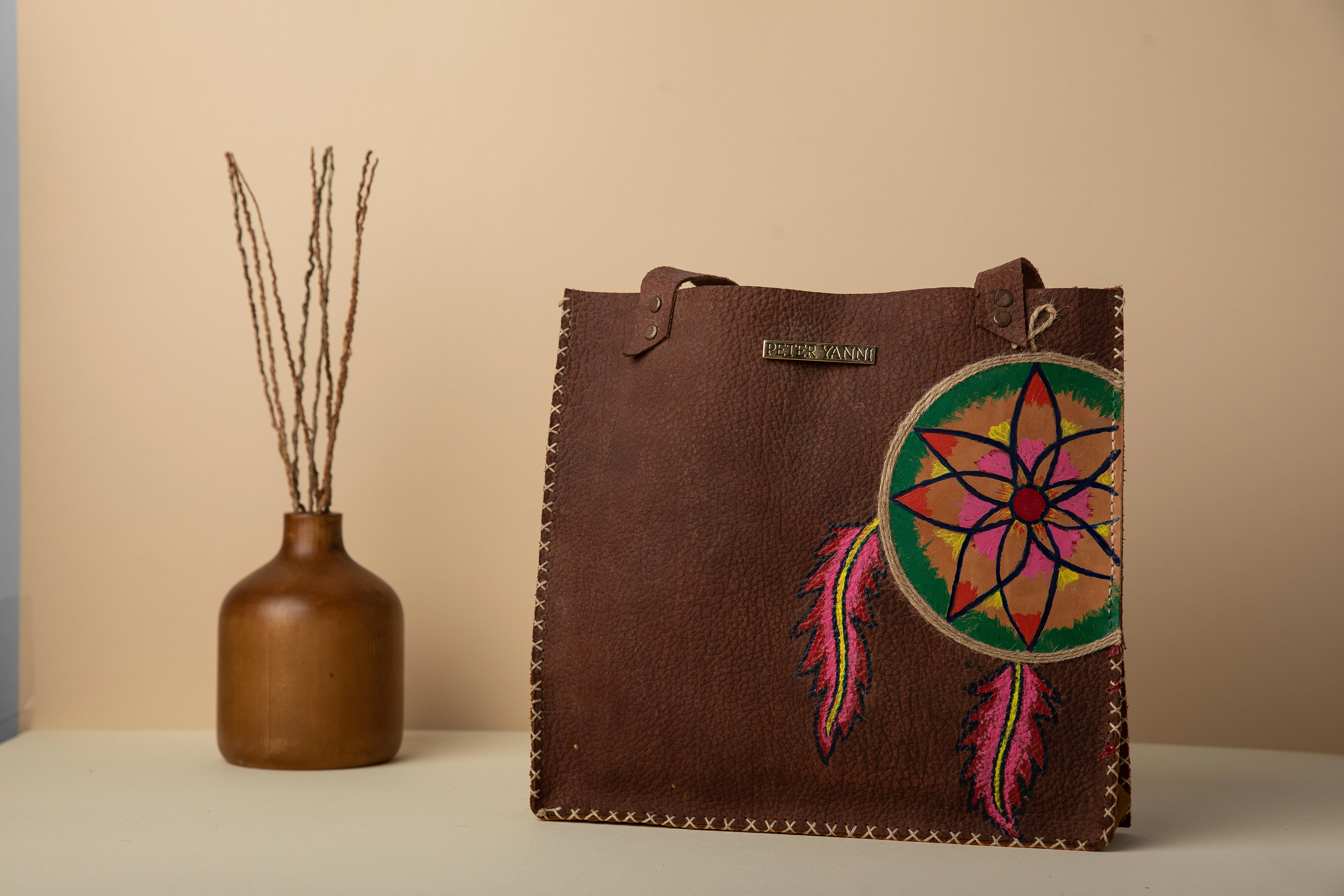 20cm x 30cm x 9cm Fully hand painted Internal genuine leather lining Back zipper pocket one year guarantee