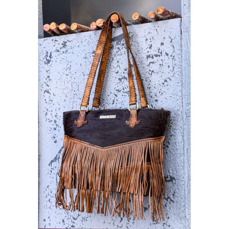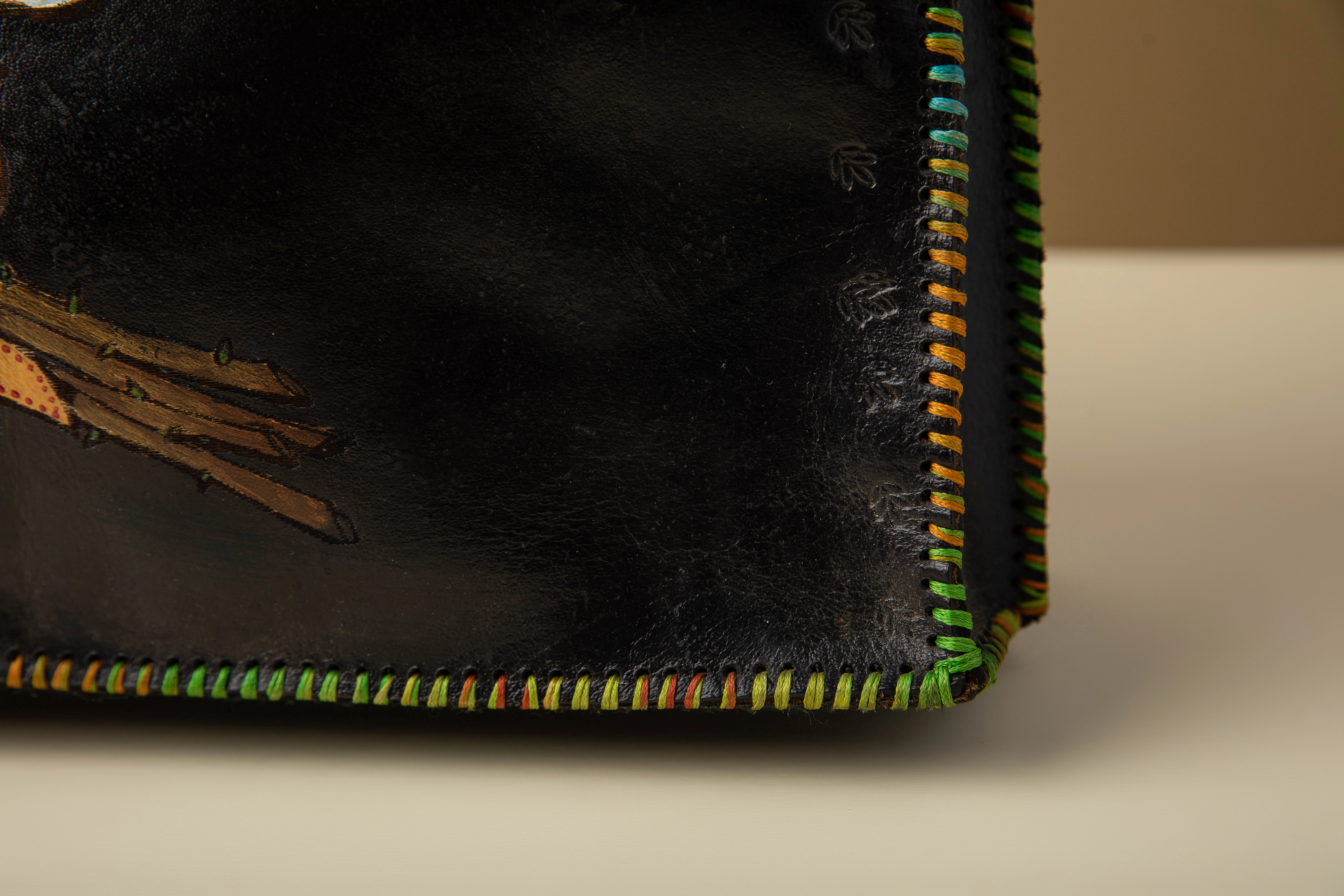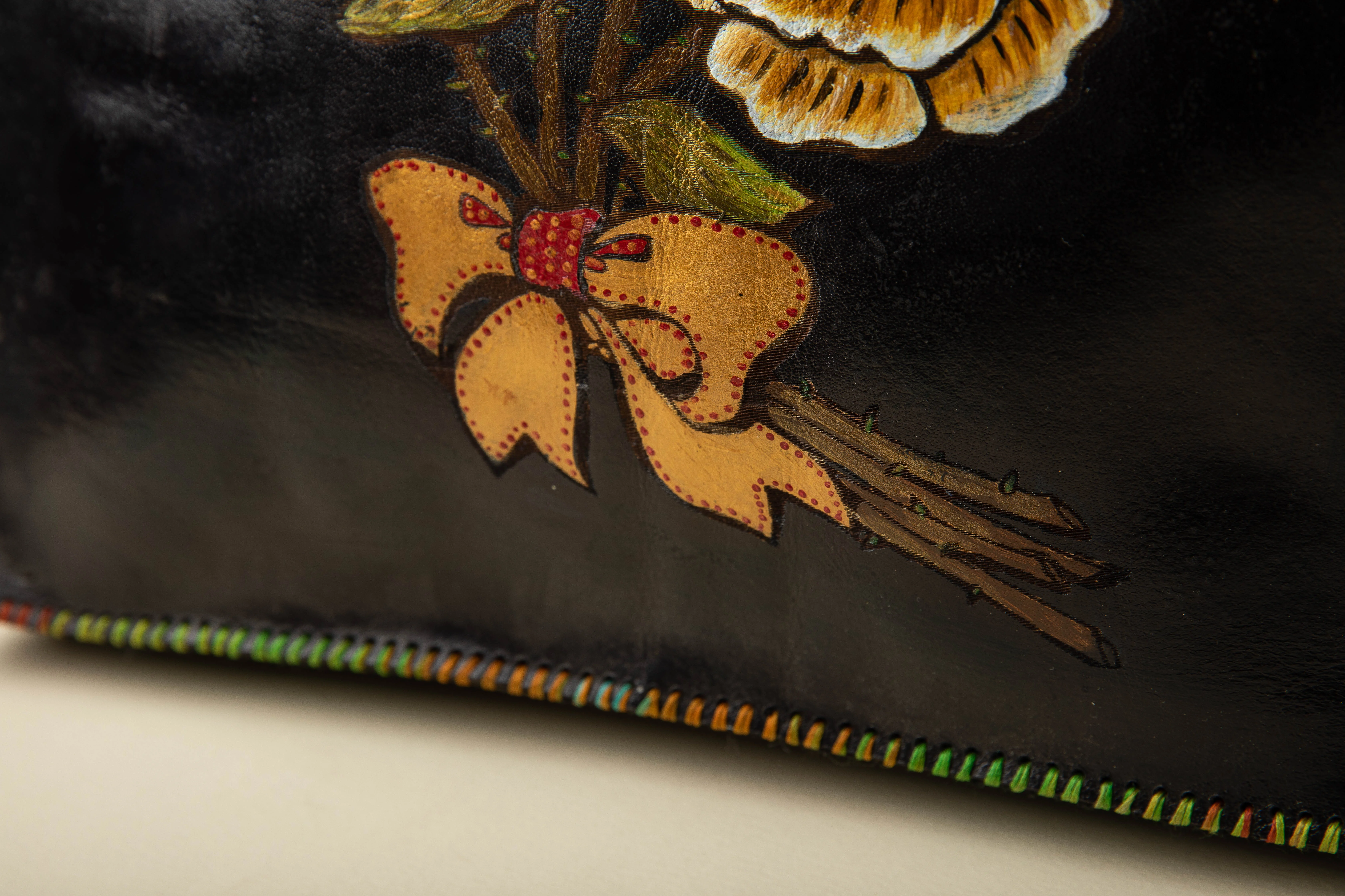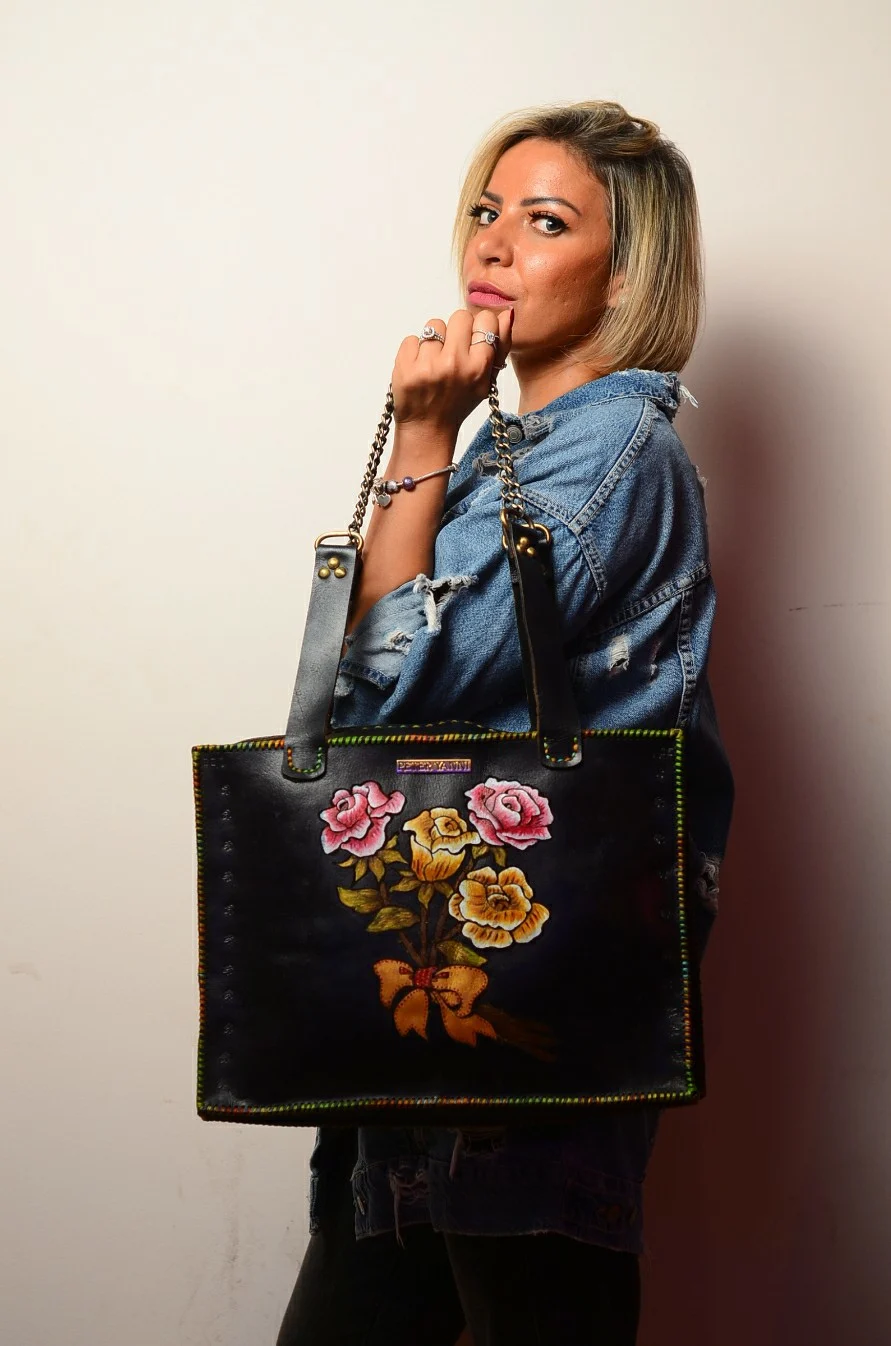 30cm x 40cm x 11cm Fully Hand painted Artwork Genuine leather interiors Internal and back zipper pockets Top Zipper Closure One year guarantee